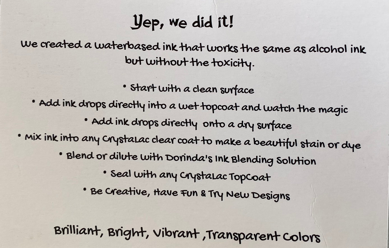 Enjoy the fun of alcohol inks without the toxicity, only with CrystaLac's waterbased inks!